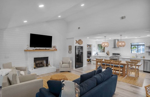 Outside has been updated with over 600 square feet of deck space equipped with flat screen TV, sitting and dining areas, propane fire pit. A large wash down patio with outdoor shower is located to the side of the house. Underneath the house is four adult bikes, beach chairs, a beach buggy, and a cooler.