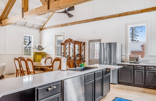 As Conover's former town hall, you’ll find a space that’s utterly unique yet fully updated. The renovated space features hardwood floors, exposed beams, soaring ceilings, and a fully open floor plan, perfect for gathering. Step into the sleek, full kitchen to whip up mealtime masterpieces, then sit down to dine together at one of several tables or the kitchen island. Comfortable couches beckon at the end of a day on the trails, or head downstairs for a game of air hockey or shuffleboard.