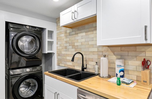The all-new interior comes fully updated for modern comfort and convenience. You'll find the kitchen ready and equipped for home cooking with a suite of major appliances and gadgets including an air fryer/rotisserie/convection oven, Instapot, a slow-cooker, electric skillet, microwave, grill, and blender. Traditional drip and K-cup coffee makers provide flexible morning brew options. Unwind in the living room after the day's activities with streaming on the 72-inch smart TV. For some quiet time alone, escape to the privacy of your bedroom and watch your favorite shows and movies on the 50-inch smart TV. There is also a host of classic board games for those rainy days or old-school fun. The "I believe in Nashville" wall mural is the perfect spot for a selfie opportunity. Home essentials include free WiFi, a private washer and dryer, and mini-split air-conditioners equipped throughout.