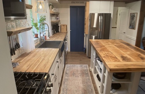 The kitchen is fully stocked with all utensils, pots, pans, serving platters, kitchen aid mixer, bowls, plates and glassware. There is an ice maker in the freezer and a bar for all of your libations.