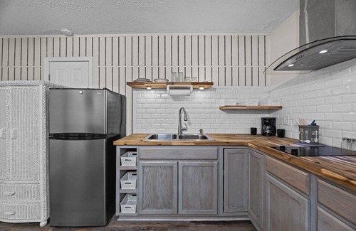 This newly renovated kitchen is beautiful and functional. It includes full size refrigerator, electric cook top, powerful range hood, toaster, microwave, double kitchen sink with pull down faucet, and drip coffee maker. There is no oven.