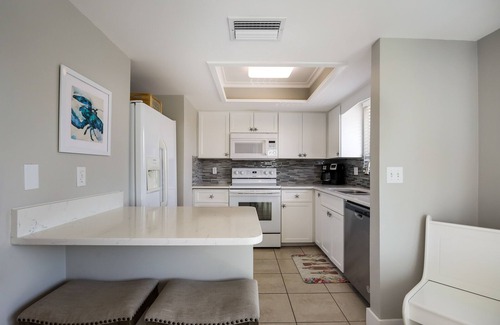 The walk-up interior has been completely renovated for carefree modern comfort. The full kitchen is appointed with all the major appliances and accessories needed to plan and prepare home-cooked meals. Stream shows and movies on the smart TV or use the free WiFi to catch up on some remote working. The private balcony featuring peek-a-boo water views is a great place to start your day with coffee. Additional perks include central air-conditioning and a private washer/dryer.