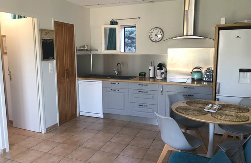 outdoor garden equipped with a round table and 4 wrought iron chairs, 2 Chilean chairs and 2 teak sunbeds, a large parasol, an electric barbecue and its accessories. A shopping trolley is at your disposal to do your shopping.
