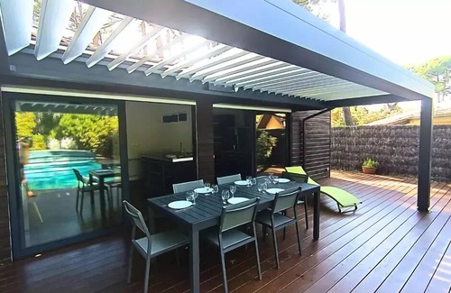 Accommodation: Contemporary villa with heated pool – 8 people – 125 m2Come and enjoy the comfort and calm in this spacious and modern villa of 125 m2, ideally located in a quiet residential area, just 1.5 km from the centre of the resort, close to the beach and close to a supermarket.Nestled on a fenced and wooded land, the house offers 4 air-conditioned rooms, a bright living room also air-conditioned, and everything necessary for a relaxing holiday with friends or family.Outdoors designed for relaxationLarge exotic wooden terrace of 160 m2 covered by a pergolaHeated swimming pool 8x4 m (depth 1.20 to 2 m) secured by a shelterSecond terrace of 40 m2 at the back of the house with garden furniture, barbecue, deckchairs, table tennis table and petanque plotBathroom and outdoor toilet adjoining the villaServices included in the rental :- End-of-stay household- Bed linen and towels- Pool maintenanceInterior design:- Living room: table, chairs, sofa, armchairs, flat screen TV, fiber optics- Fully equipped American kitchen:American fridge, ceramic hob, oven, microwave, dishwasher, coffee maker Dolce Gusto, toaster...On the night side:1 bedroom with bed 160 cm, TV2 bedrooms with 160 cm bed, dresser, TV1 bedroom with bunk bed 90 cm, TV1 bathroom with washing machine1 bathroom2 WC (indoor +outdoor)