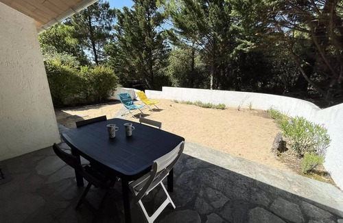 Accommodation: In the residential and wooded area close to the parée Jésus, 600m from the beach and shops nearby, this quiet area is located in the middle of the pine trees, close walks in forest and bike paths.This pleasant and spacious holiday home offers a large living room/lounge with convertible corner sofa and TV, a fully equipped kitchen (electric oven, microwave, fridge/freezer, 4 induction lights, dishwasher and washing machine), a beautiful back terrace with garden furniture and barbecue, a bedroom with a double bed 160, a 2nd bedroom with a double bed 160, a bathroom, a separate toilet.The plus of this rental at the sea: Foreground and back closed and well exposed. Free public parking. High chair baby and changing table available.Household end of stay included.