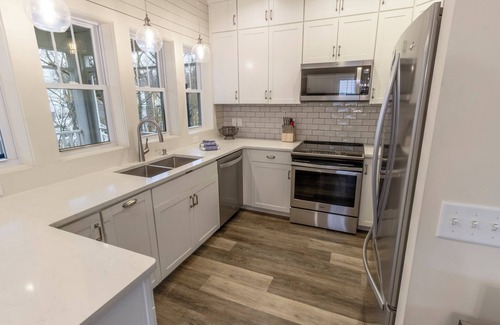 The heart of One Big Holiday is its open-concept main level, designed to bring everyone together. Sink into the plush sectional in the living room, accented with cozy throw pillows—the perfect spot to relax after a fun-filled day at the beach. Enjoy movie nights on the 50” TV or gather around the large dining table that seats 10 for a family meal. The space is bright, inviting, and thoughtfully decorated to make you feel right at home.