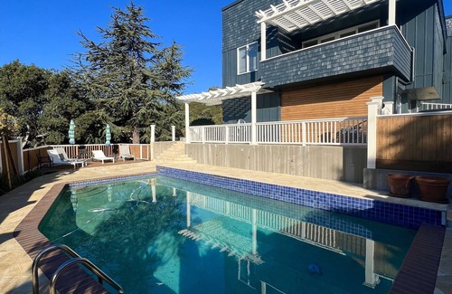 The house is next to hillside open space with fantastic mountain biking and hiking trails that make it easy to stay in shape (or get in better shape) while vacationing. The gourmet kitchen is very large with an L-shaped bar where everyone gathers, and there are three outdoor patios for dining or just gazing at the views. The master bedroom and bath are spacious and complete with a Bay view. The guest bedroom with king bed has a full view of the hillside and San Rafael.. And the third bedroom with hillside views sleeps two on a queen bed. The office has french doors leading to the pool and hot tub. Complete with Wi-Fi. Fireplace and swimming pool included as well as two large screen HD tvs. Parking for two cars.