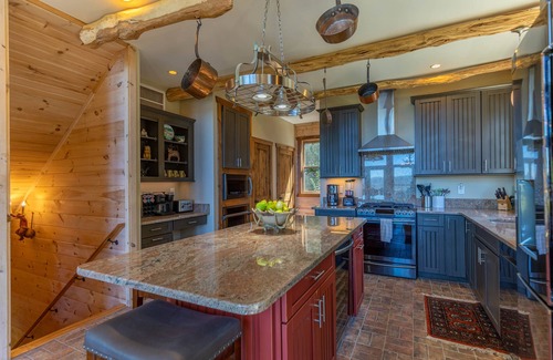 On the main level you'll find an open Great Room with exposed bark log beams, vaulted ceilings, a stone gas log fireplace, circular couch, big HDTV, a wall of windows overlooking the layered mountain views, and access to the deck. There's a gorgeous kitchen with wine cooler, island, granite counters, and stainless appliances including double ovens, double microwaves, and a gas range ready for entertaining. Seating for everyone is available with the dining table and four bar-height seats at the counter. Off the kitchen, you'll find a main level half-bath. On the other side of the Great Room, you'll find the King Master Suite, featuring a beautifully tiled walk-in shower, direct access to the deck, a large closet, and a private flat screen TV.