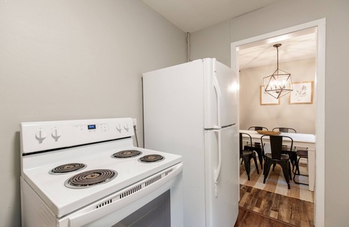 The living room is open and spacious, connected to the dining area. Leather sofa and accent chairs provide plenty of seating for family and movie nights. The kitchen is stocked with cooking essentials, a Keurig coffee maker and drip coffee pot. The backyard is fully fenced for pets and kids to enjoy! There is a grill near the covered patio, enjoy the evenings outside! This home is cozy and well cared for, we know you'll enjoy your stay!