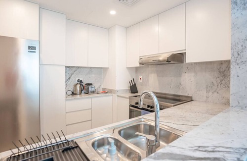 Guests have full access to the entire 2-bedroom sanctuary, including a well-equipped kitchen, inviting living area, and peaceful bedrooms designed for restful nights. A fully equipped gym is available for your fitness routine. A Large pool, kids pool, kids play area with a background of Burj Al Arab