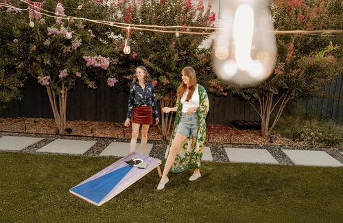 Play cornhole or giant Jenga on the synthetic turf lawn, or relax on lounge chairs by the sculptural deck. Perfect for golden hour hangs and group play.