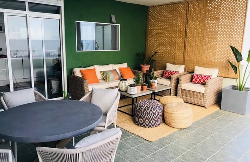 Large terrace of 37 m2 and small terrace of 7 m2 equipped with a comfortable sitting area and dining area.