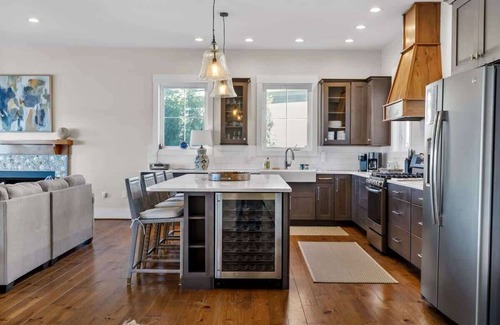 Inside, River Bluff Retreat offers hardwood floors throughout the two-story home. This beautiful 3bdr home has a master bedroom, with a King bed, spacious master bath and is conveniently located on the ground floor. Upstairs you'll find two bedrooms, one with a queen bed and the other with 2 double beds and a bunk with a double bottom and single top. Jack n Jill bathroom and each bedroom have its own sink/toilet area. A cozy sitting room with a daybed and trundle is nestled in between. The large living room and kitchen boast an open concept, with a fully equipped kitchen and an inviting island for entertaining. Along with a half bath conveniently there for you or guests to use.