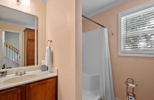 This elevated 2 story home has 2 bedrooms, 2 full baths, and offers an open concept living/kitchen/dining area. The cozy living room has a large screen for streaming your favorite shows. You and your guests can enjoy meals sitting at the bar height table or sitting on stools at the kitchen counter. The full size kitchen has all the necessities for your stay including dishes, utensils, cookware, stainless steel double sink, stove, microwave, refrigerator, toaster oven and Keurig coffee maker. The full size washer and dryer are conveniently located in a laundry closet off the kitchen. The first floor bath has a walk in shower, while both bedrooms share the upstairs bath with walk in shower and large tub! (Note: Jets do not work in tub!) Upstairs the main bedroom has a queen bed. Bedroom #2 has a queen bed and bunk bed.