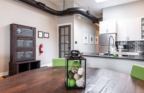 At the River Merchant Inn & Spa, your beautifully decorated and fully furnished 1000 sq. ft private retreat is on the bank of the picturesque Avon River. This full size, 2 bedroom apartment is a historical experience detailing, and using archive pictures and memorabilia, the original uses of this unique downtown building beginning in 1860 as the Mitchell, Caven & Co Mercantile store. Upon 2018 restoration, this building was the winner of the 2018 James D Anderson Heritage Restoration Award. After a day of walking just steps from your door to any of the 3 Stratford Festival Theatres, and many riverside and downtown activities, relax in the elegant and very unique Modern Industrial decorating by the fireplace, in the deep soaker bath tub, playing some vintage games on the game table, or unwind at the attached Illume Spa. Your Suite is located in the heart of Stratford’s beautiful, historic, tourist downtown with shops, outdoor cafes, restaurants, and activities. Other jewels in the crown of this one-of-a-kind Mitchell’s Mercantile Suite are the picturesque views of the river and downtown core as well as the abundant light from the soaring 8’ windows. In addition, the new state of the art kitchen is fully equipped with full-size large and small appliances, dinner service, cookware, essentials like spices, coffee and tea’s, and is ready for the fresh ingredients you can find at the weekend Farmer’s Market in the downtown square. A private entry code lock makes checking in and out a breeze. Free in-suite laundry is provided for your convenience. It is the perfect getaway for families, friends, couples, or business.