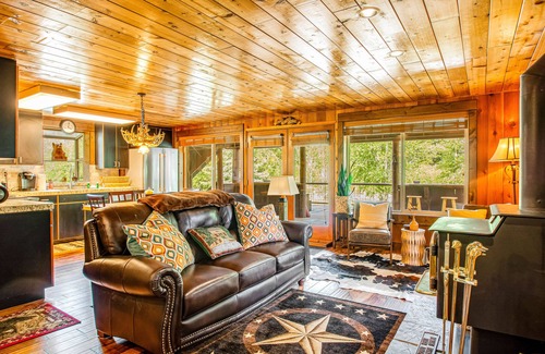 Inside, you’ll find all the comforts of home. Hardwood floors, pine-paneled walls, and a cozy woodstove enhance the cabin vibes, and the open layout makes gathering together easy. The chef will love the full, well-equipped kitchen, which features stainless steel appliances and plenty of prep space, and the gang can eat together at the large dining table. Spend the day exploring and then relax together in the living room in front of the woodstove, or head upstairs to the second living space.