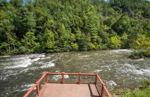 Riverfront Premium Cabin is a crowd-pleaser on the Tellico River. This beautiful 3-bedroom, 3 and half-bath log cabin can sleep up to 10 people. Large cabin with a massive 25-foot ceiling. on the Tellico River. Directly on the river with spectacular views of cascading rapids and a 300-foot rock face in the background. Enormous private deck that hangs out over the river adds to those views of the Tellico River. Located In the mountains but 2 miles from the small historical town of Tellico Plains and very easy to find. There is cell service also! It is on the Cherohala Skyway so perfect for Motorcyclists and Fisherman.