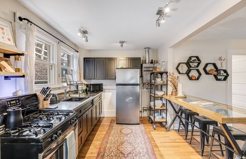 Curated design, hardwood floors, and exposed brick weave a tapestry of charm throughout the common area. Retreat to one of three beautiful bedrooms, each graced with a queen bed. The primary suite, a pinnacle of indulgence, boasts an ensuite bathroom featuring a clawfoot tub and a washer and dryer. A second shared bathroom, also adorned with a clawfoot tub, serves the remaining bedrooms.