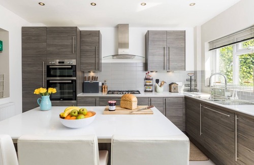 Heading to the rear of the property is the modern and stylish kitchen. It is a wonderful space, with light streaming in from the south facing garden through the bifold doors. The kitchen is fully fitted and includes an island with breakfast bar stools, dishwasher, gas hob, microwave, Nespresso coffee machine, as well as plenty of kitchenware and storage space for guests.