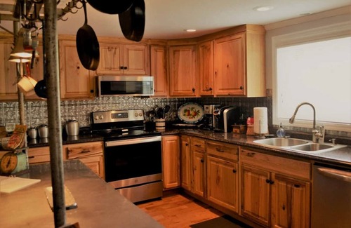 Inside, the cabin is full of rustic charm and cozy touches, creating a warm and welcoming atmosphere. With 2 comfortable bedrooms and 3 beds, it sleeps up to 4 guests—ideal for friends, couples, or a small family. A shared bathroom includes a full size washer and dryer. Starter Soap and Shampoos are provided.You will find a Coffee Bar in the kitchen that includes Ground Coffee, K-Cups, assorted Sweeteners and Creamers and To-Go Cups.