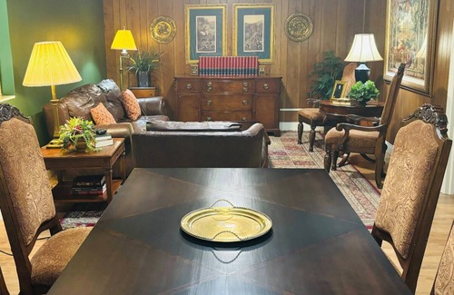 Welcome to our peaceful place in north Macon! The basement is separate from the rest of the house, yet decorated as part of our home--not as just a rental--it feels very cozy. It is incredibly quiet and we are surrounded by nature. It is the perfect place to relax, rest, and recharge. The king bed has a memory foam mattress and a variety of pillows (can be separated into 2 twins if preferred). There is a coffee making station, a microwave, and a mini refrigerator. The bathroom is spacious and includes storage space for towels and laundry baskets. There is a large living/dining combination room perfect for relaxing, playing board games, or getting work done. The basement has a separate entrance that opens to a brick patio overlooking the woods. A brick staircase leads through the garden to your parking space on the driveway. We love our quiet street and the sound of the birds singing. This is a perfect place for a wedding weekend, personal retreat, or a home away from home while visiting Macon. Very close to Wesleyan College, Ingleside Baptist Church, and Coliseum Northside Hospital.