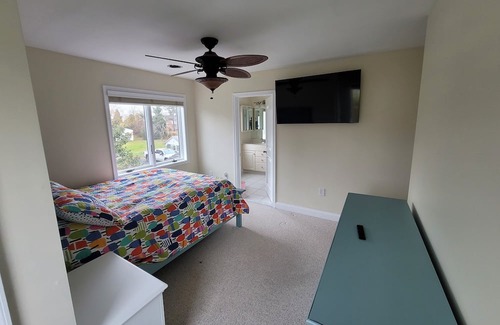 The den is a great place to relax, and play for children, and watch movies on an 85'' TV. The den has a pullout sofa bed. There is a large foyer with a coat closet and stairs leading to the second and third floors. There is bedroom (king) and full bath on the first floor.