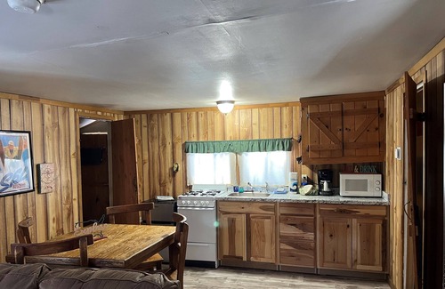 Rock Squirrel is a cozy 1 bedroom cabin with a queen bed. There is a 4-person dining table with chairs in the fully stocked compact kitchen. The full bathroom has a toilet, sink and stand-up shower. There are 2 outdoor areas to choose from. You might hear the river from the covered front porch while you sip on your morning coffee on table and chairs. The back porch features a sitting area with a propane gas grill and picnic table. Soak away your cares in the new hot tub or cozy up by the antique gas fireplace in the winter and watch your favorite movie! Rock Squirrel is one of six cabins that was built in the 1940's as a logging camp that helped Ruidoso to become the village it is today. We have kept the vintage charm alive while trying to give you all the modern amenities that you enjoy at your own home.... This cabin is located in the Upper Canyon, just a short walk away from the Rio Ruidoso. Wildlife is never far away… here you will see deer, turkey, elk, and in the warmer months, you may even see a black bear!