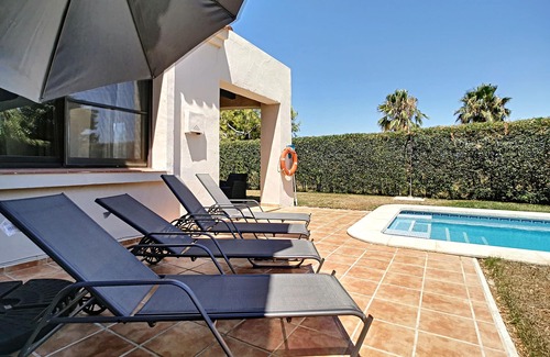 The villa has its own private pool with heating as an optional extra. There is a large grassed garden and BBQ dining area and the covered patio has chill out sofas to sit and relax or watch over the pool area. The ground floor has the main bedroom and en suite, a large lounge with dining area, fully equipped kitchen and a cloakroom toilet. Just outside the kitchen is a covered utility room with the washing machine and access to the garden and BBQ. The first floor had a double bedroom with access to a balcony with views over the golf course, and the other 2 bedrooms have 2 single beds. The first floor also has 2 bathrooms, 1 has a bath and shower and the other a shower.
