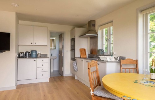 Enter the property via the balcony area, and head straight into the open plan kitchen, dining and living area. The kitchen has all mod cons, from a wall-mounted oven and microwave to electric hobs, a kettle and toaster, as well as a large fridge and a stainless-steel sink. The dining area is tucked neatly into one corner with windows for beautiful bucolic dinner views. The table seats 4 guests for meals and drinks. There is a large corner sofa in the living area of this bright and airy open-plan space. It seats four comfortably for watching movies on the wall-mounted TV, or two people can stretch out after a day of walking the coast path or sea swimming.
