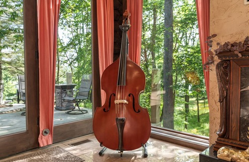 The Grand Old World is very upscale for an opulent feel. The 5 Star property is a delightful mix of log construction and antique chandeliers. The first thing you will notice is the high gloss beautiful marble-like flooring throughout. The Tulip style windows are reminiscent of a European Cathedral on the large window wall giving you a direct view of the outdoors and lovely gardens, trees, and sky all the way through the ravine and to the water. The morning sun is especially beautiful streaming through the windows and simmering off the metallic copper ceilings throughout. The jewel of the Grande Old World, second only to the multiple ornate gilded mirrors, is the huge wrought-iron chandelier with dozens of candle lights. It was a real find in a Panama City Beach junk yard and shipped here for the purpose of restoration and use in this old world suite. The authentic plaster and log walls create a feeling of stepping back to a French or Italian county estate. The Master Bedroom with king bed and en-suite is spacious and has a shower with multiple shower heads and a rain feature. The pebble shower floor flows freely through the bathroom and under the copper clad claw foot tub and double vanity with beautiful gilded mirrors. You have the feeling of a cobble stone path winding aimlessly. The fully appointed Kitchen has granite counter tops and a copper sink. The black stainless full size appliances slip seamlessly into the decor. The modern comforts and amenities are all included. The loft expands for a Spa room with Sauna, Massage Chair and Massage table and a second bathroom. The décor is extended to this space with no lack of detail. The bathroom boasts a gorgeous chest with detail and beauty unsurpassed. There is an additional TV. A double chair and ottoman round out the living room in the loft. It is a complete additional space for a second couple or friends travelling together. The 4 person hot tub, for your relaxing pleasure after a bike ride or hike or for no reason at all, is under a covered outdoor space. Enjoy it rain or shine. High speed Wi Fi make catching up with business or staying in touch with social media easy. Big screen Roku smart TVs in both bedrooms and great room. (We hope you abandon these habits and truly disconnect for a rejuvenating experience.) The Grande Old World has 1,250 sq. ft. of room to stretch out and enjoy your quiet time.