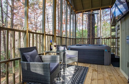 • Private hot tub on a screened-in deck with outdoor Smart TV for movies, sports, or music under the stars