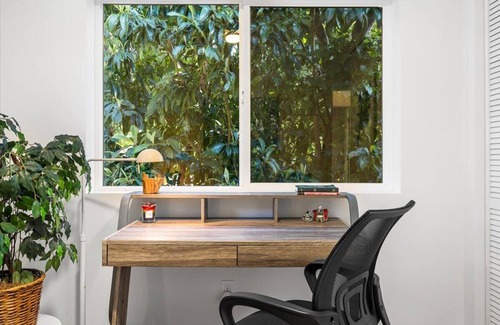 This brand new home is flooded with light and is the perfect home/work base. One bedroom features a queen bed while the second bedroom is an office with a guest couch. The living area opens to the deck where you can enjoy a freshly made espresso under the cabana or in the hammock and take in the amazing view of the river and the redwoods. The home comes with up to 3 parking spots in the garage and a car charger. The river is yours, take one of the kayaks and just head down to your private shaded riverfront. No parties. This is best suited for a couple. A child could be comfortable on the daybed in the office.