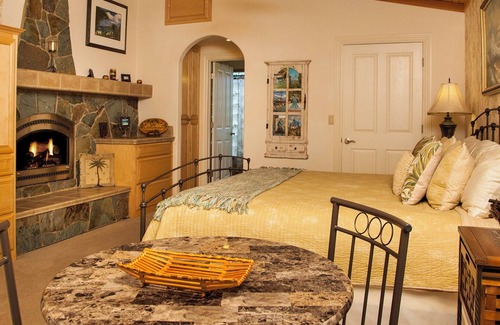 Cozy Comfort: The studio features a king-sized bed, a gas fireplace for chilly evenings, and a smart flat-screen TV with Roku streaming for entertainment.