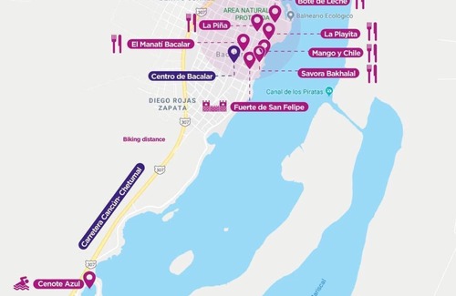 Bacalar es un Pueblo Mágico, lleno de colores y sabores mexicanos. La ciudad es fácilmente accesible a través de una caminata o bicicleta y encontrarás todo tipo de tiendas y restaurantes cercanos.