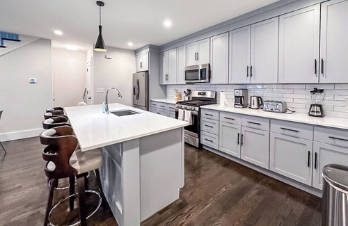 On the second floor, you’ll find two cozy bedrooms. The first features a queen bed, a 43-inch TV, and a private balcony. Enjoy the closet space and a full bathroom with a shower. The second bedroom also has a queen bed, 43-inch TV, a closet, and a desk for convenience, along with a private full bathroom with a shower. The washer and dryer are conveniently located in the hallway.