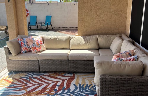 Beautiful Family friendly neighborhood. Sparkling pool spa, umbrella's, BBQ, outdoor dining table and patio couch. Wheelchair accessible shower in master bedroom. Spacious rooms, printer in work area. 65" Smart TV in Family room and Master bedroom