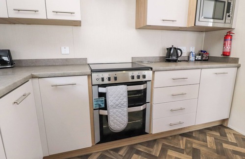 Amenities: central heating. Gas oven and hob, dishwasher, washing machine, microwave, under counter fridge and under counter freezer. Smart TV, TV and WiFi. Fuel and power inc. in rent. Bed linen and towels inc. in rent. Off-road parking for 2 cars. Enclosed, wrap-around decking with furniture and lockable gate. Sorry, no smoking. Pub 0.1 miles, beach 0.7 miles. Note: There are a few steps up to the lodge, please take care. Note: On-site facilities include an indoor pool, sauna, bar and restaurant, adventure playground, amusement arcade and multi-sports court- payable locally. Two well behaved dogs welcome
