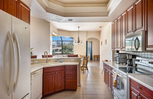 Mature landscaping, a paver brick driveway, and a leaded glass front door provide a serene welcome as you arrive at this beautiful home in the peaceful community of Rotonda West. The kitchen offers ample cabinet space, Corian countertops, and a lovely breakfast bar and nook with clear glass views of the pool area, perfect for the early birds! The adjoining family room is ideal for unwinding while enjoying the water views of the canal or maybe even a lovely book!