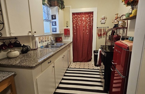 Plenty of natural light surrounds this serene romantic space. Comfortable sofa and small bar area in living room to relax. Georgeous european style crowned queen-sized bed with a unique style side table, sitting space, mirrors, and more. Small closet in bedroom to accommodate your belongings. Both, living room and bedroom, with 43 inch smart TVs and other free Roku channels. Full kitchen with granite counter tops and many essentials to stay in and have a romantic home cook dinner. Small office corner space with wifi. The outdoor patio is fenced and has acces to a private driveway where you can safely park your vehicle. Outdoor table with chairs, umbrella and a grill provided to spend some time outdoors. Book today & experience this georgeous, serene, romantic & stylish Erupean decorated space at Europa.
