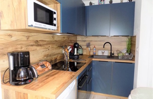 After a walk to the famous central market of Royan, you can prepare your meals in the newly renovated kitchen area of this flat! At your disposal a vitro hob, an electric oven, a microwave, a coffee machine, a toaster, a kettle, a dishwasher and a table top fridge...