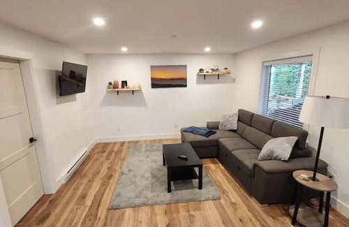 Built with traceling professionals in mind, and located just 400 ft off the beach, this brand new, 2 bedroom lower level suite features 1 new queen bed, 1 double bed and a pull out couch. There is one large bathroom with full sized tub/shower, in suite laundry, Wi-fi, and smart TV ready for you to log into your streaming services. You can relax on the ocean view patio 4 min from town, make the 2 min trip to amazing coffee house or pub which often features live music, or stay in and utilize your fully equipped kitchen. We are also 5 minutes from the award winning Kingfisher Resort and Spa.