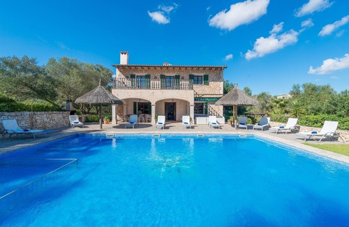 Just outside the small town of Petra, the Villa Sa Sinia is set in a rural location with magnificent views over the surrounding countryside. This typical Majorcan house, which can accommodate 12 people, has a living room, a well-equipped kitchen, a dining room and 6 bedrooms with en suite bathrooms. The child-friendly villa also has Wi-Fi, air-conditioning, a cot, a high chair and a parking space on the property. Relax and enjoy yourselves in the breathtaking garden with its 80-m² pool, which also has a small, separate area for children, and its covered terrace with seating area, table tennis table and barbecue. Sa Sinia leaves nothing to be desired and offers you absolute peace and privacy. The nearest restaurant, which is run by the owners of the villa, is only a few minutes’ walk away. Here, you will get your meals served if you book breakfast or half board as an additional service (without drinks). Shops in Petra are 10 min by car and the nearest beach is around 30 minutes away in the car.