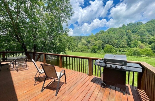 Rushing Waters - An riverfront cabin paradise! Privately located on 2 riverfront acres by the New River with creek frontage, mountain & long river views. Fish, tube or swim the New River located at the edge of the yard. Take a bike ride along the riverfront roadway, picnic by the river, enjoy the firepit or a relaxing soak in the hot tub. Something for everyone! Designed for the larger family to enjoy! Each room of this cabin offers excellent river and mountain views.