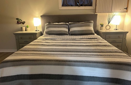 Rustic and stylish renovated unit. Close to Niagara Falls, as well as many wineries in the area. Ideal for single occupancy professionals, or couples. Centrally located and close to the highway for easy accessibility. Kitchen is fully equipped with a regular sized oven/ stove and fridge. Unit also has basic kitchen appliances such as a toaster, Keurig coffee machine, kettle, etc. Coffee pods and tea bags are also provided. As well as clean towels and linens. This unit is fully independent with no shared spaces. Guests have driveway access (up to 2 cars), which is right beside the entry door. Digital keypad entry for guests for easy self-check in process.