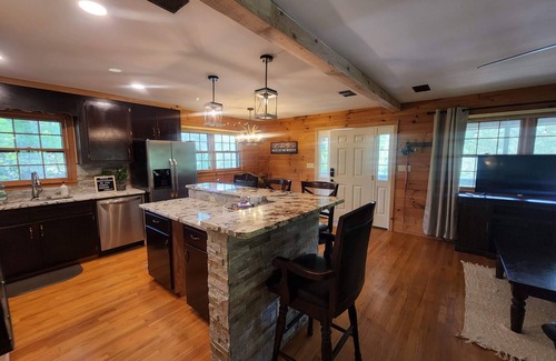 The open-concept common area includes a fully renovated kitchen, perfect for cooking and gathering. Whether you’re streaming a movie, preparing a meal in the well-stocked kitchen, or enjoying board games around the original wood-and-leather dining table, this home is designed for connection and comfort.