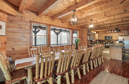 -Step into the vaulted great room with a wood-burning fireplace, comfy seating, and Smart TV—ideal for movie nights or winding down. The adjacent dining space features a full-length cedar table for 16, perfect for meals, games, and late-night laughter.