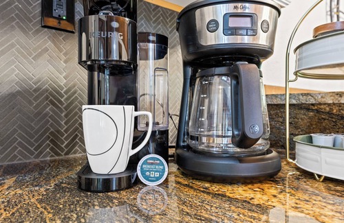Every guest will feel pampered with 2 queen bedrooms, 1 king bedroom and a fun bunk room, with queen over queen bunk beds, that’s perfect for kids (or kids at heart). On the main level, the primary queen suite offers a private en-suite bathroom, additional bedroom and bathroom, as well as plush bedding for a restful night’s sleep. Downstairs, you’ll find a king bedroom, a fourth bedroom with queen-over-queen bunk beds, and a third bathroom — ideal for families or group getaways. The bathrooms continue the cabin-chic aesthetic with spa-inspired details: stone showers, deep soaking tubs, and soft lighting for the ultimate unwind.