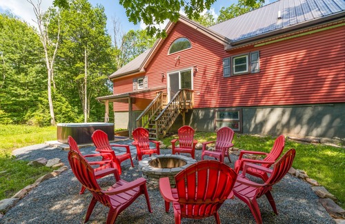 Explore the beautiful Pocono Mountains in this Rustic mountain home! The backyard hot tub & fire pit is a perfect place to share stories from the day, whether you're enjoying the nearby hiking trails & lakes or you're coming home from a day at the water parks. The beautifullyrenovated basement offers a pool table, ping pong, & theatre (100” screen) for everyone to spend time & relax comfortably. Enjoy a BBQ on the front porch in a serene & quiet setting with sweeping forest views! Pet friendly!