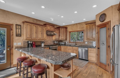 As you step into Rustic Pines, you'll be enveloped by a warm, inviting atmosphere that seamlessly blends rustic charm with modern luxury. The heart of the home is the great room, where a wood-burning fireplace creates a cozy ambiance, perfect for gathering with loved ones after a day of exploration. The open kitchen, equipped with state-of-the-art appliances, invites culinary creativity and shared meals.