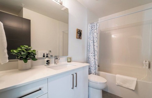 From preparing gourmet meals to whipping up quick snacks, the modern kitchen is a highlight of the condo.